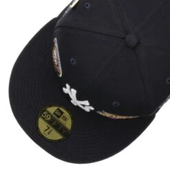 Die Fitted Cap verfügt über eine verstärkte Front und den charakteristischen geraden Visor, auf dem sich der nicht minder typische, glänzende Sticker findet.