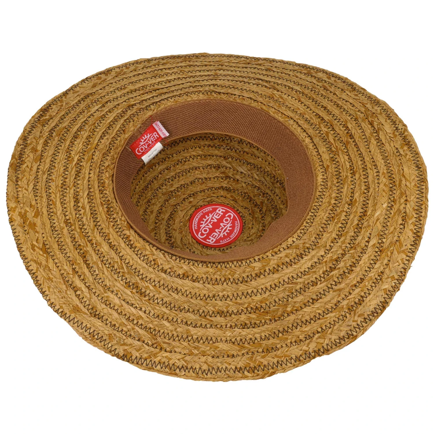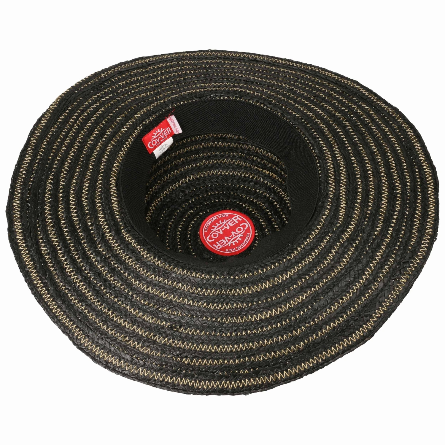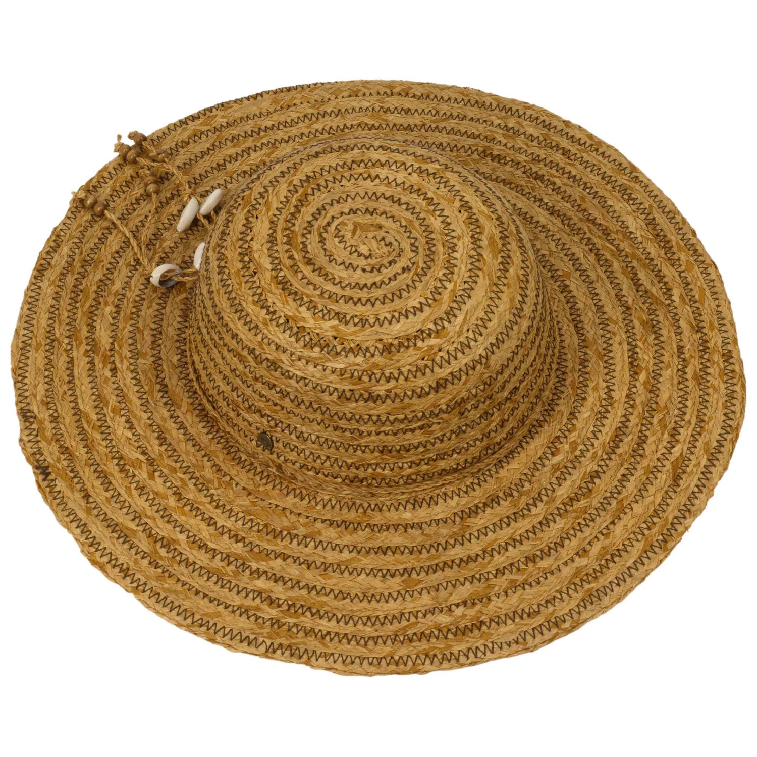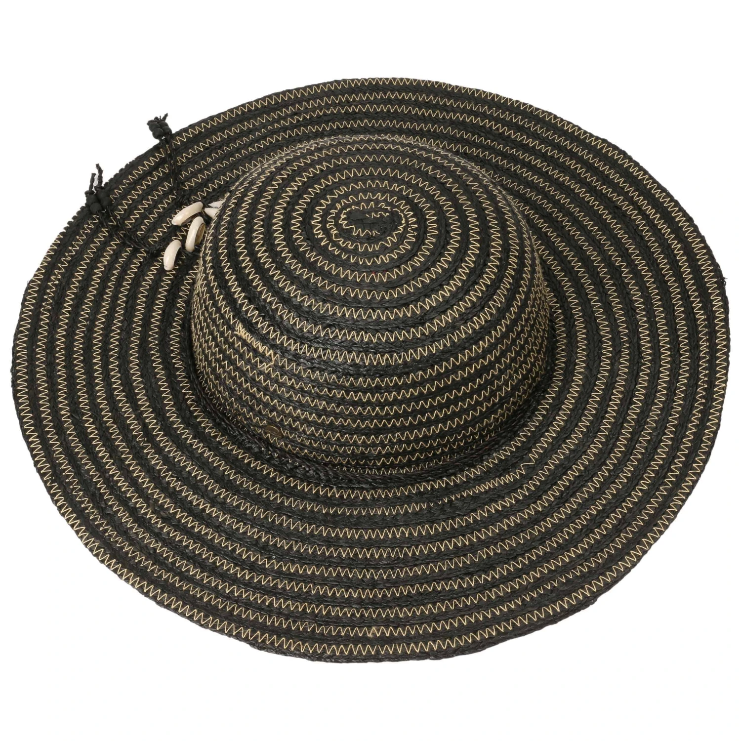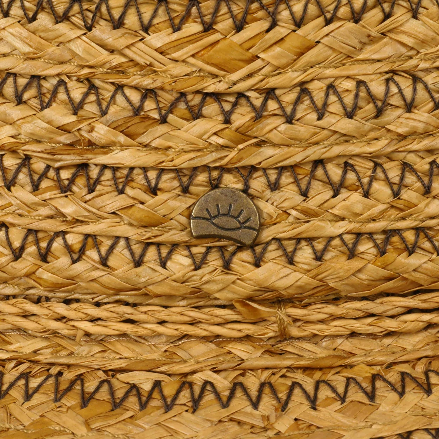 Bei dem geringelten Strohhut aus Raffiaborte sind die Zick-Zack-Nähte in kontrastreichen Farben abgesetzt.