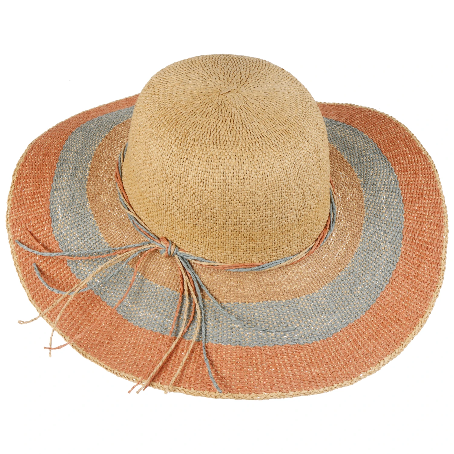 Aus einem hohen Anteil sommerleichtem Papierstroh geflochten, erhebt sich über der gestreiften Krempe formvollendet die unifarbene Krone, lässig umgeben von einer farblich abgestimmten Kordelgarnitur.