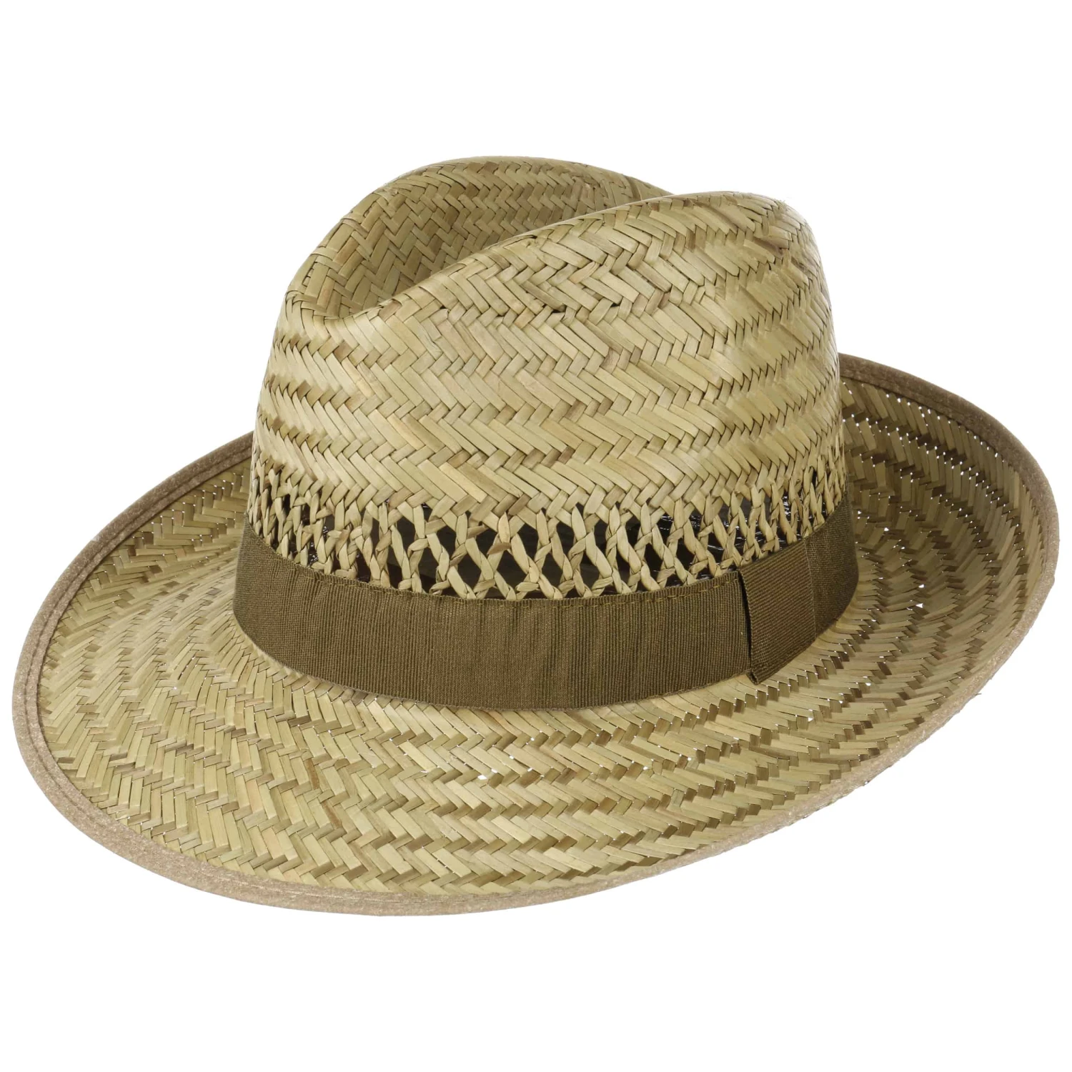 Eine zeitlose Bogartform mit breitem, olivfarbenem Garniturband – auch ideal als Geschenk!