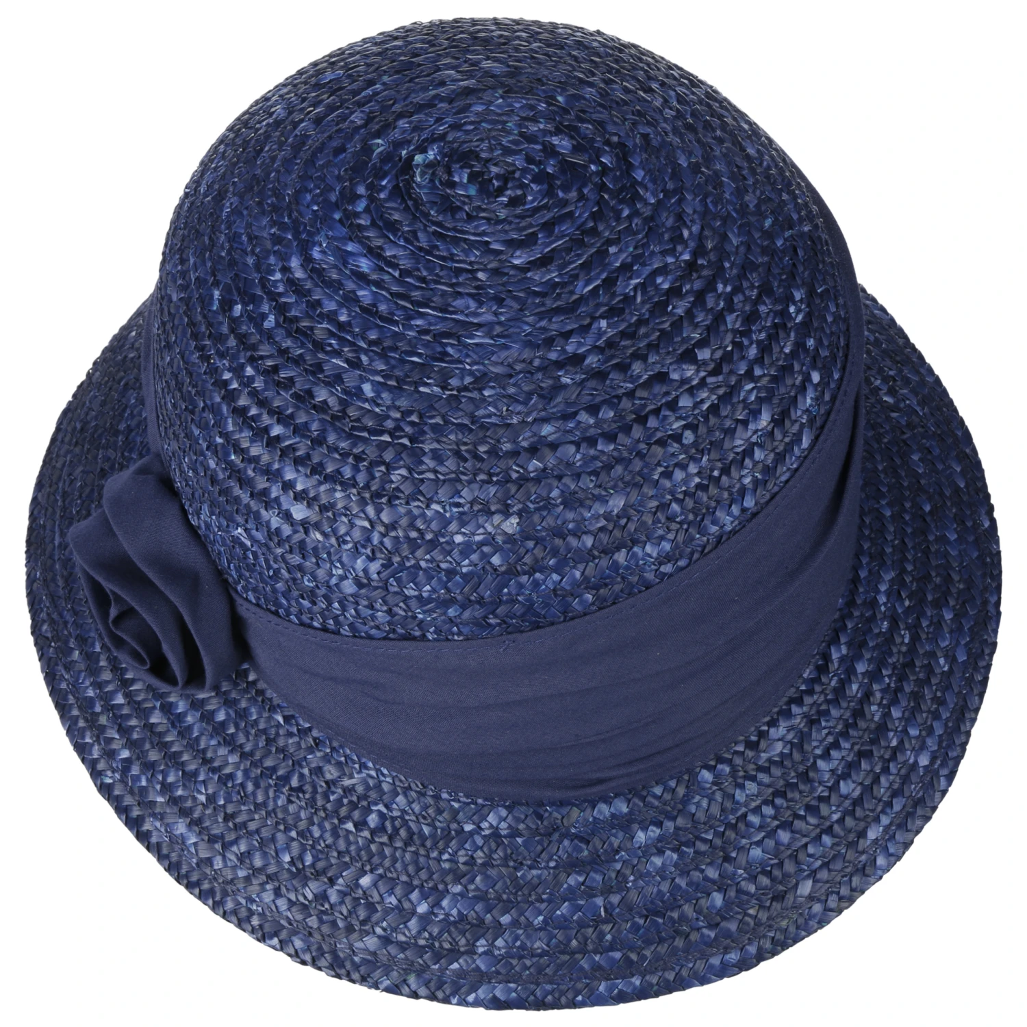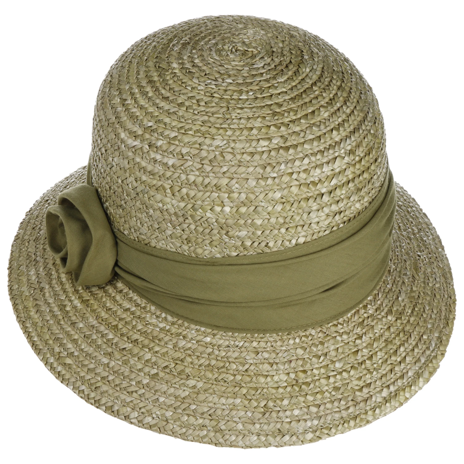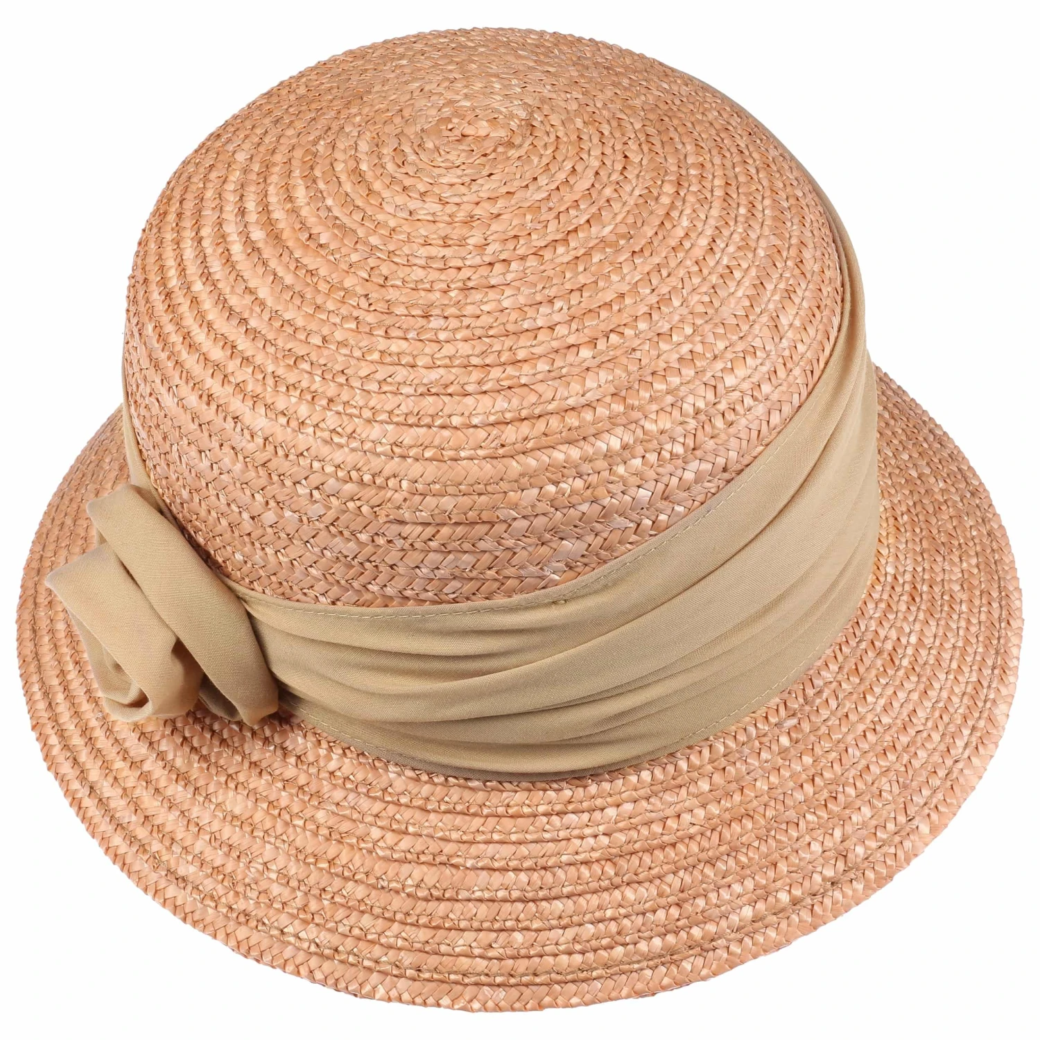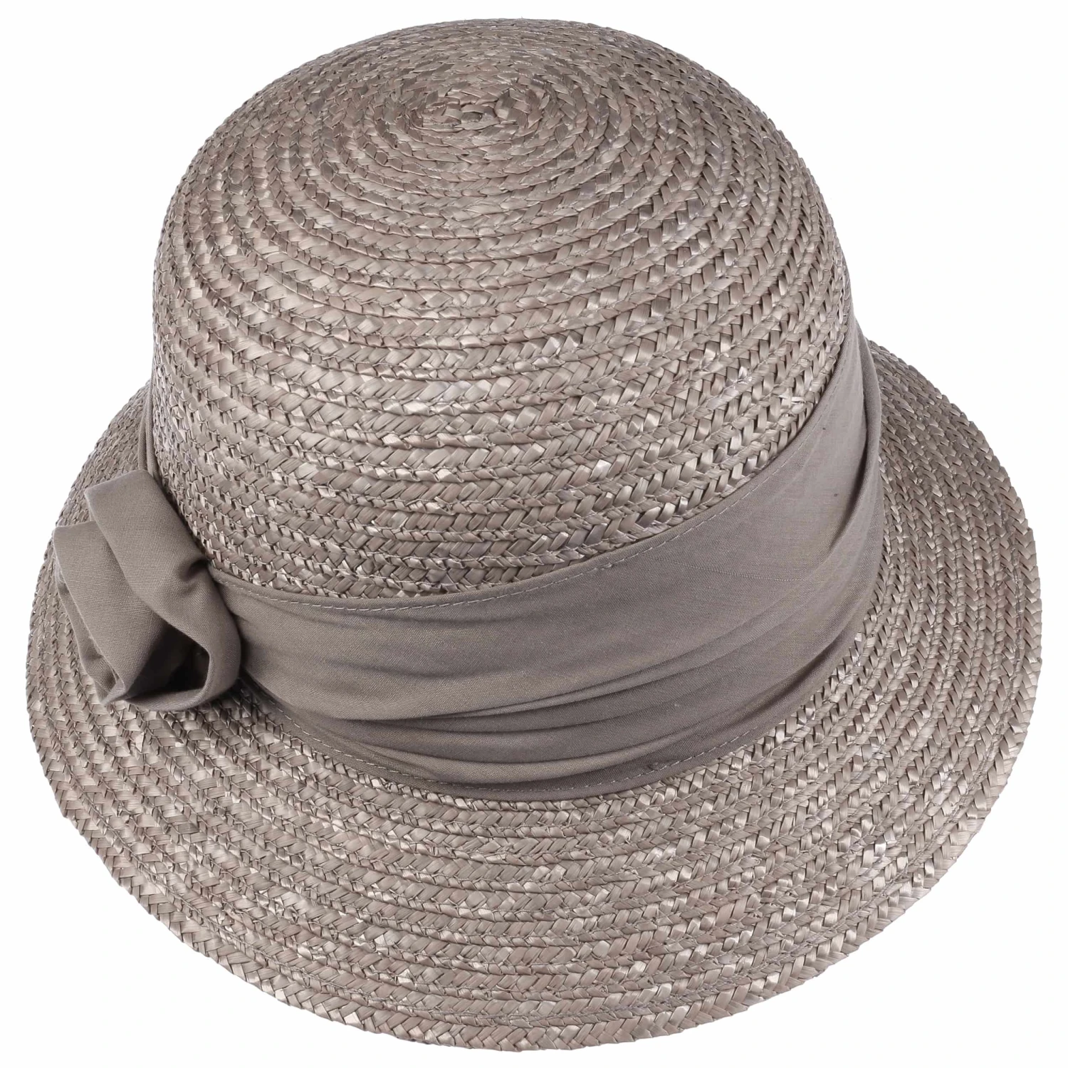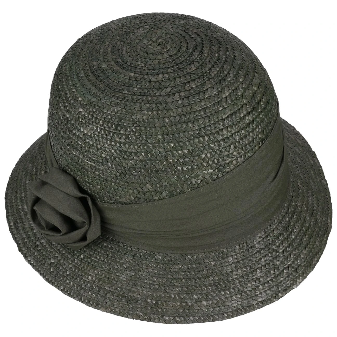 Feminin und verspielt umrankt ein Stoffband mit Blüte den klassischen Strohhut von Seeberger.