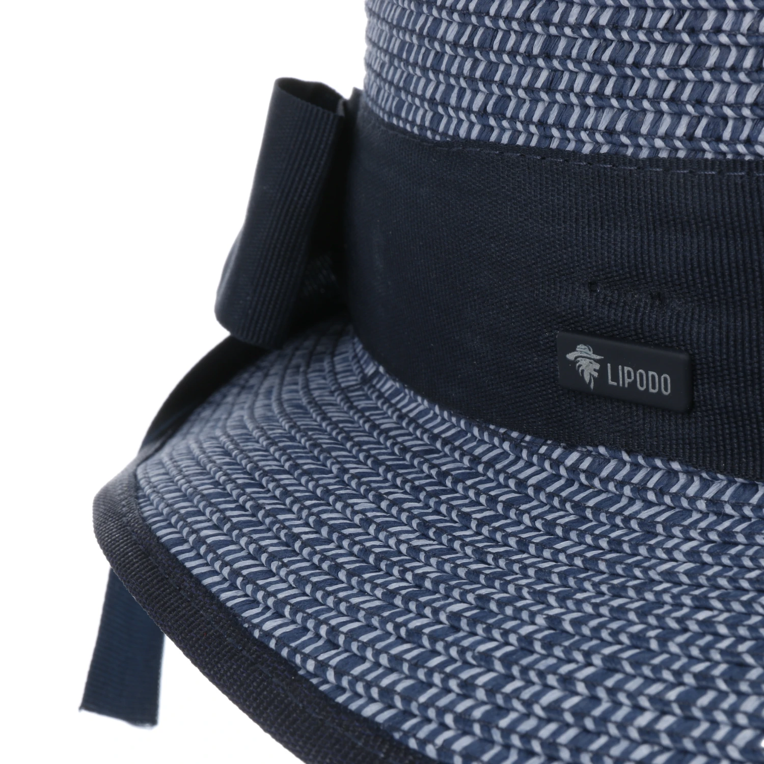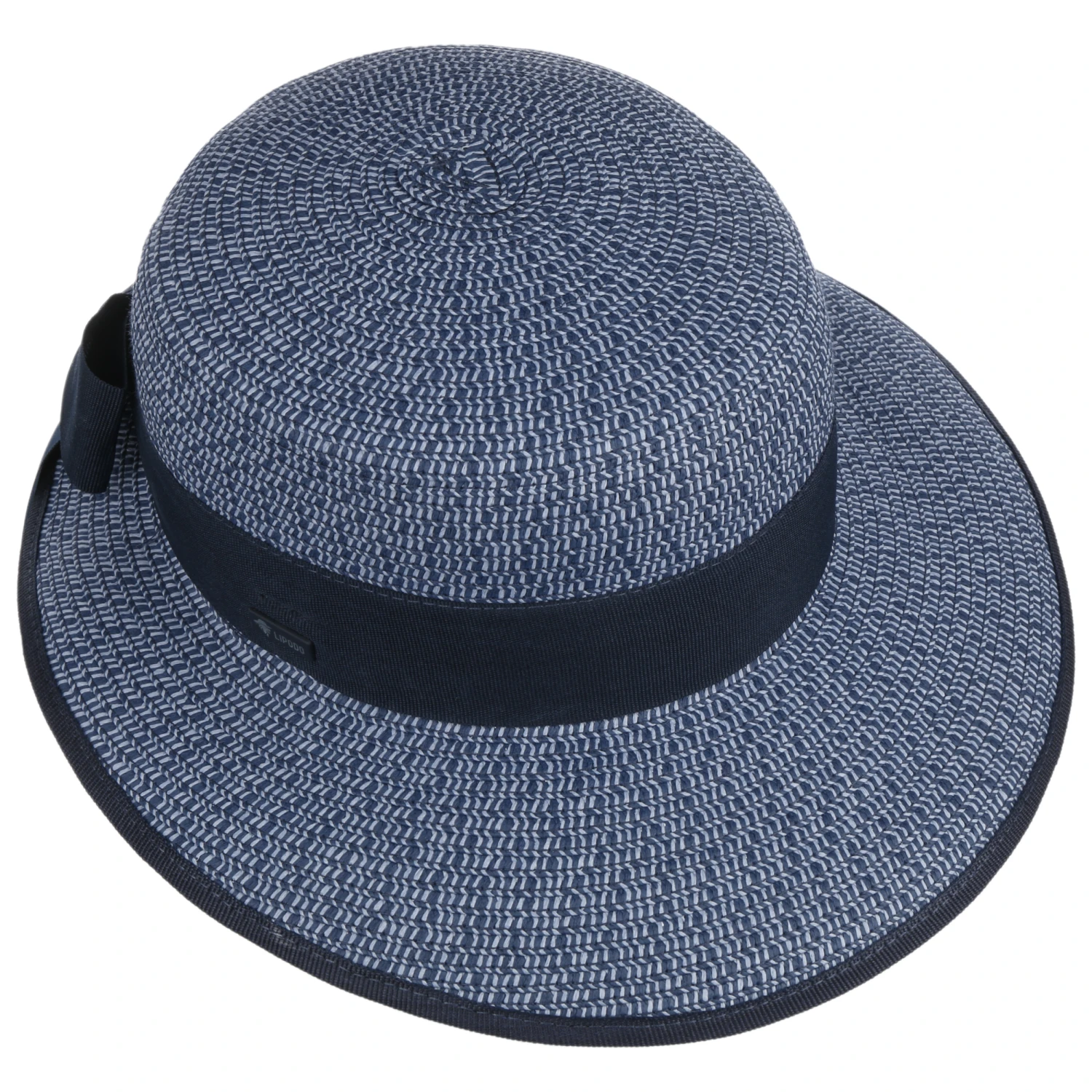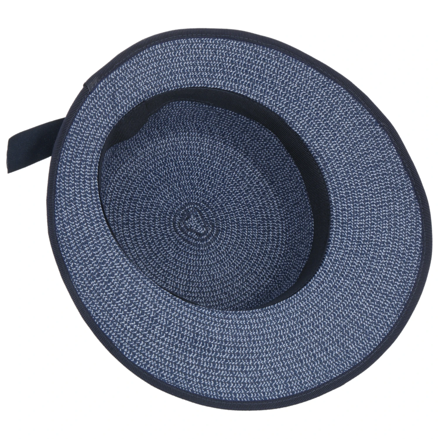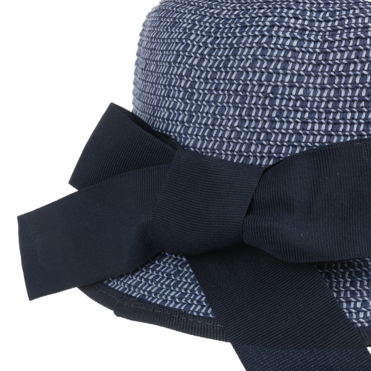 Das melierte Design des Strohhuts wird durch eine unifarbene, hinten in einer Schleife endenden Ripsbandgarnitur sowie einer Einfassung um die Krempe geschmackvoll modisch unterstrichen.