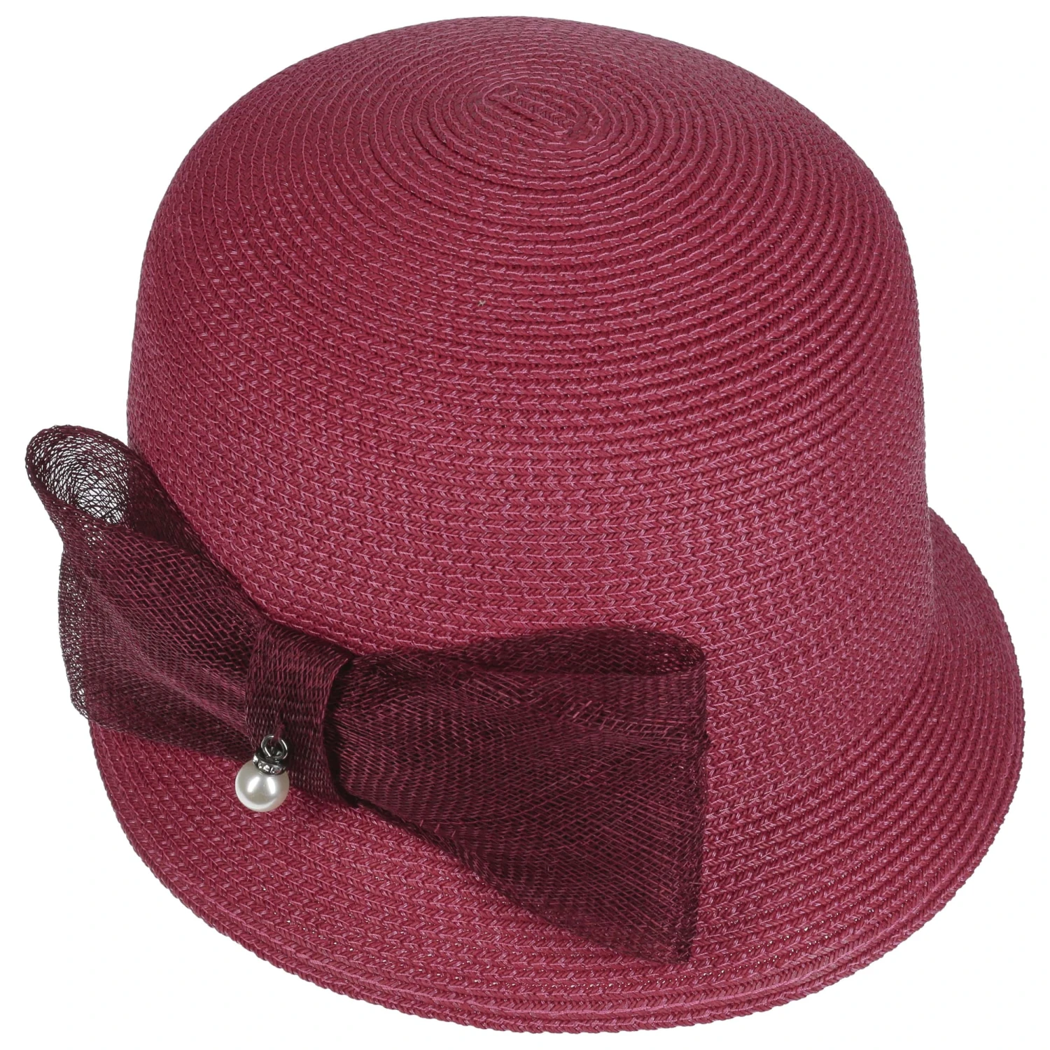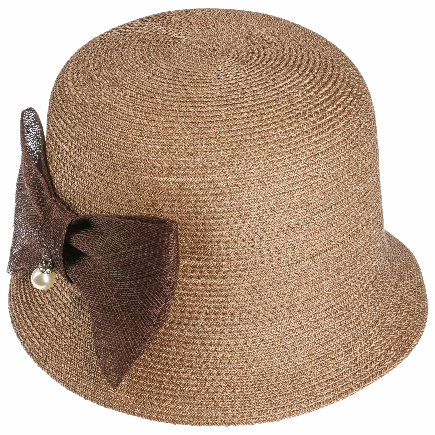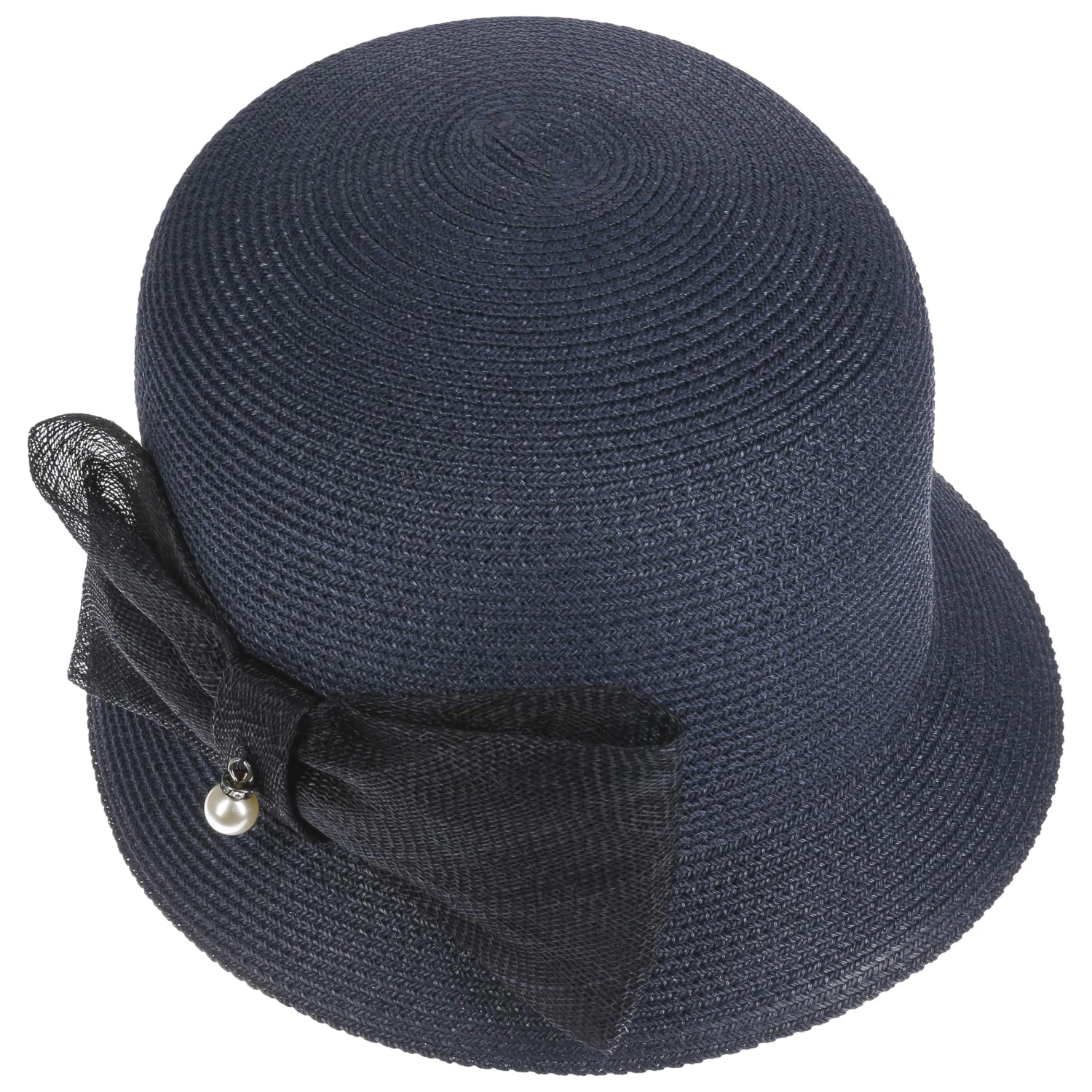 Eine große grobmaschige Schleife setzt sich farblich vom feinsinnig ausgearbeiteten Flechtwerk des Strohhutes ab. Auf dem stilvollen Schmuck ist eine sanft schimmernde Deko-Perle befestigt, die ihrerseits von elegant funkelnden Steinen in Szene gesetzt wird.