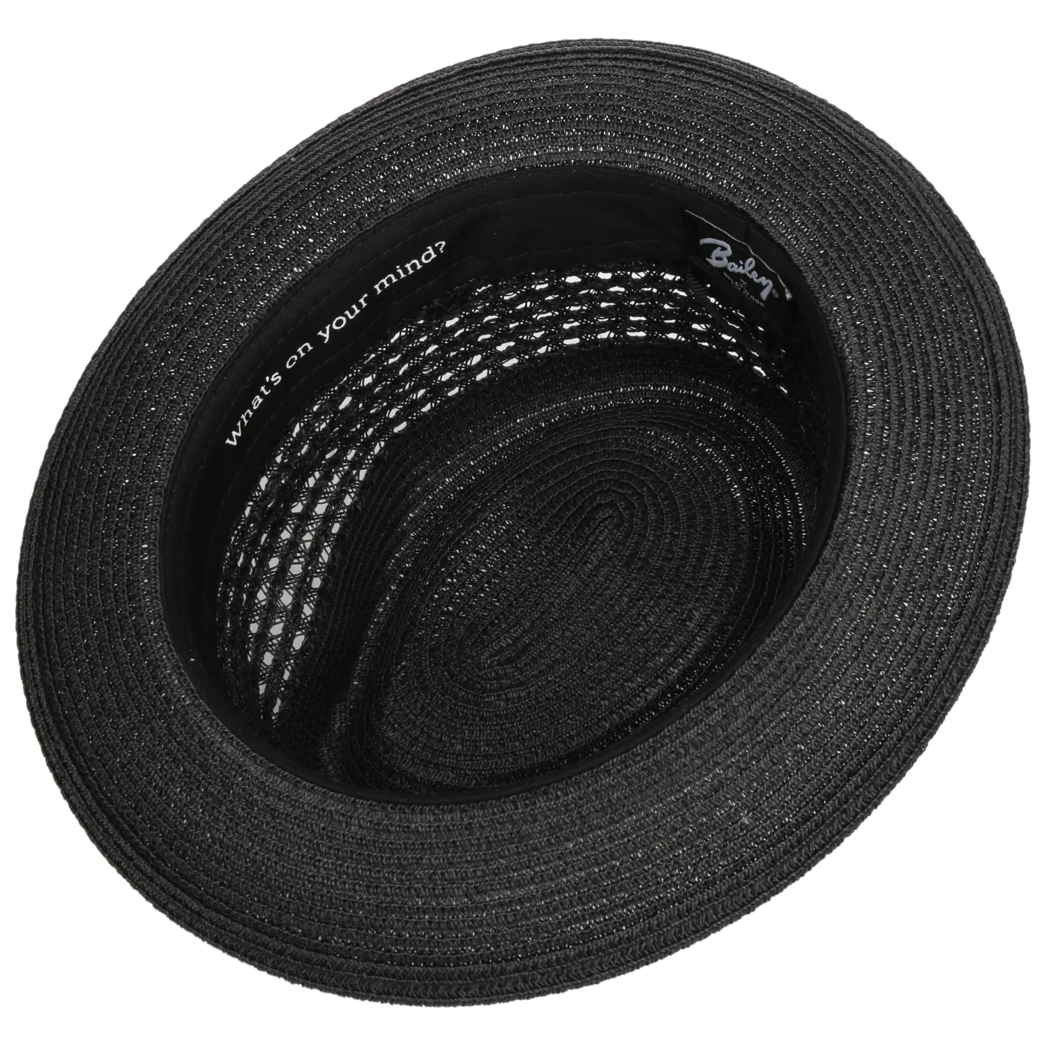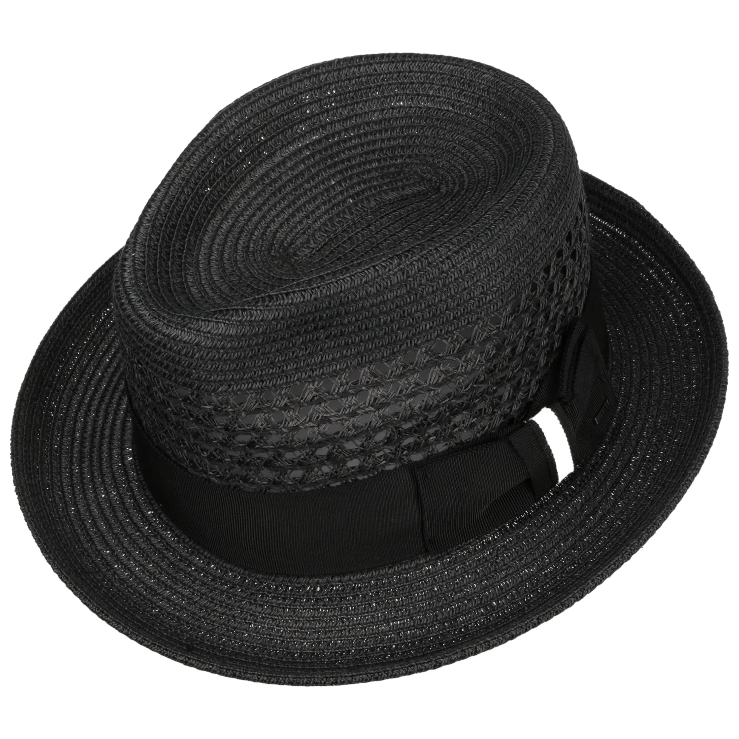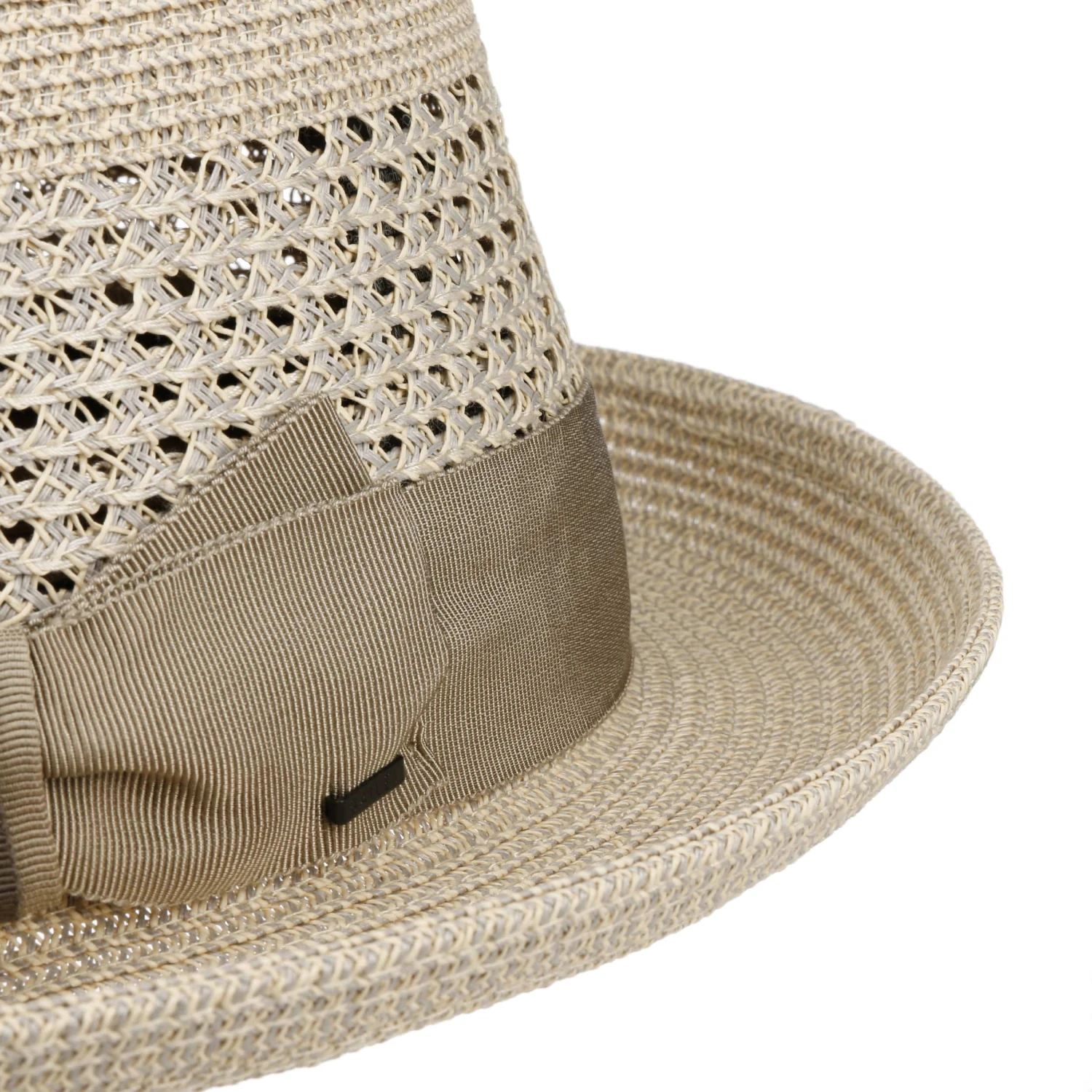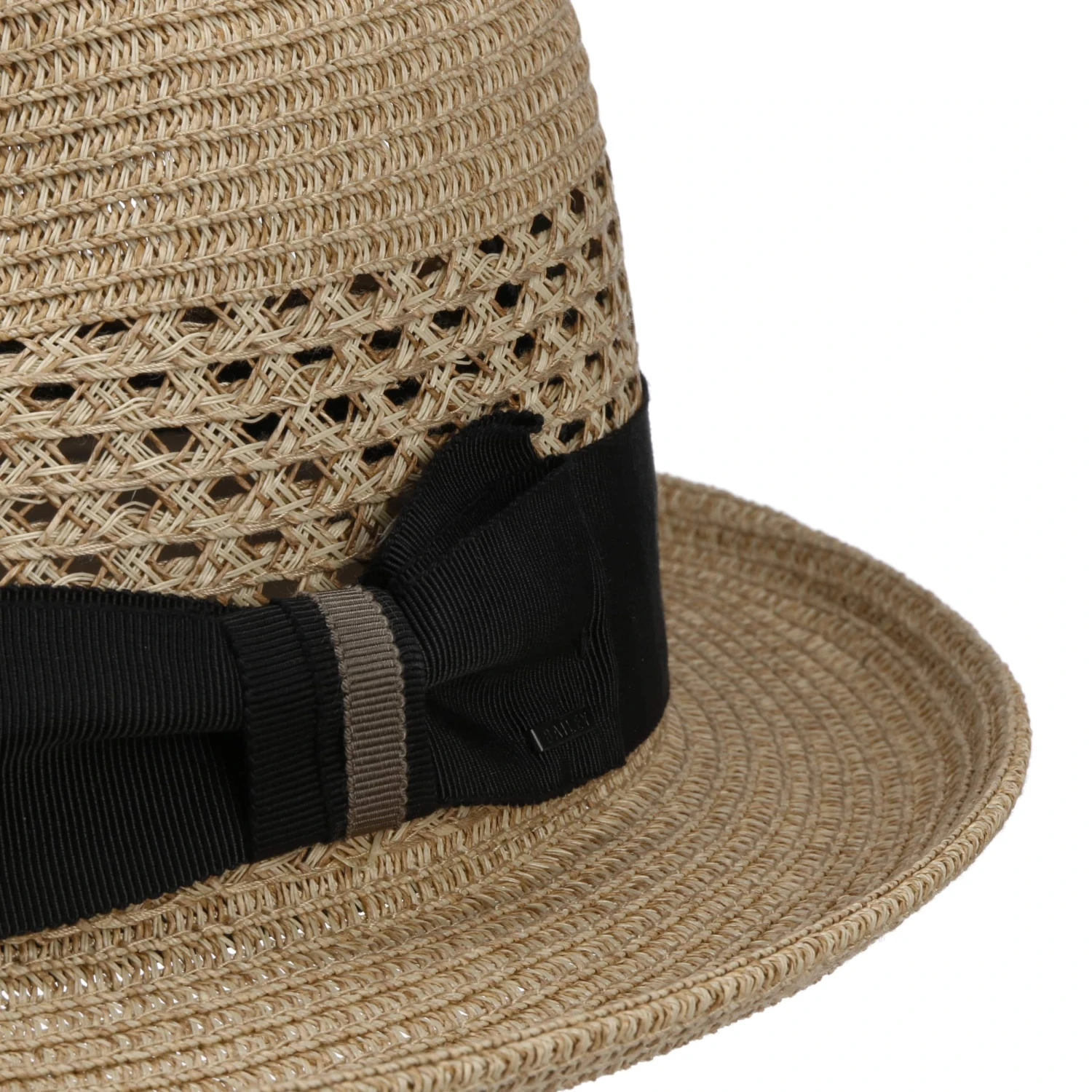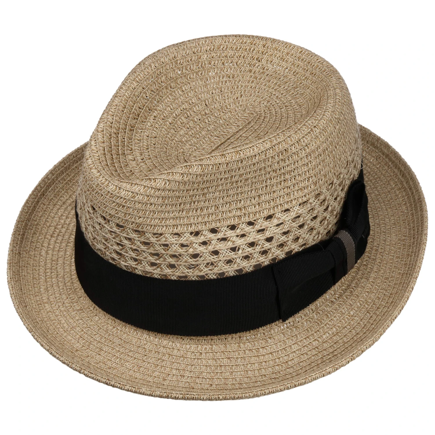 Unterschiedliche Flechtmuster und ein schönes breites Dekorband erweisen sich hier ebenso als ansprechende Akzente, wie auch die galante Form eines typischen Player-Hutes. Tiefe Kniffe und eine schwungvoll nach oben geneigte Krempenkante kreieren einen charmanten Look.