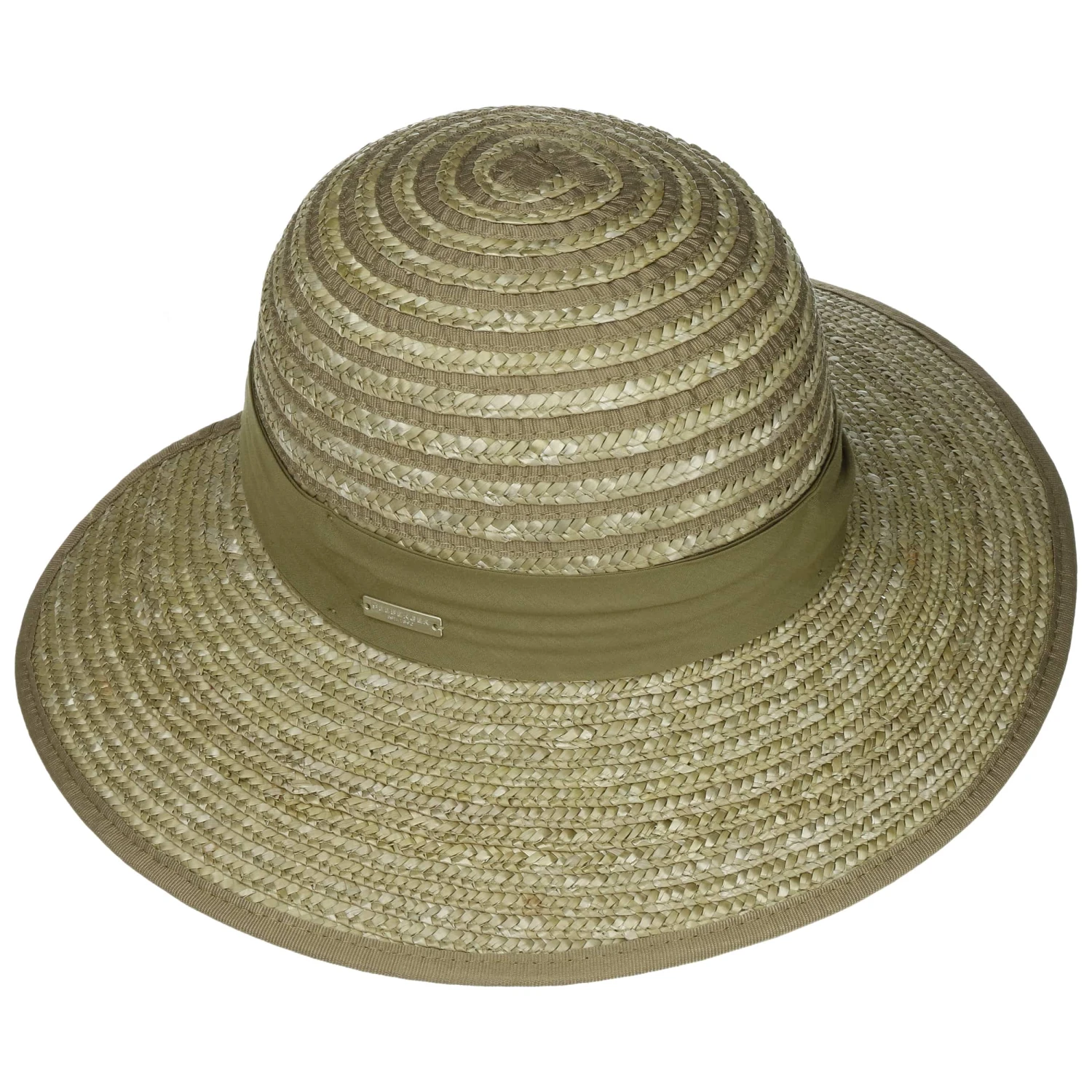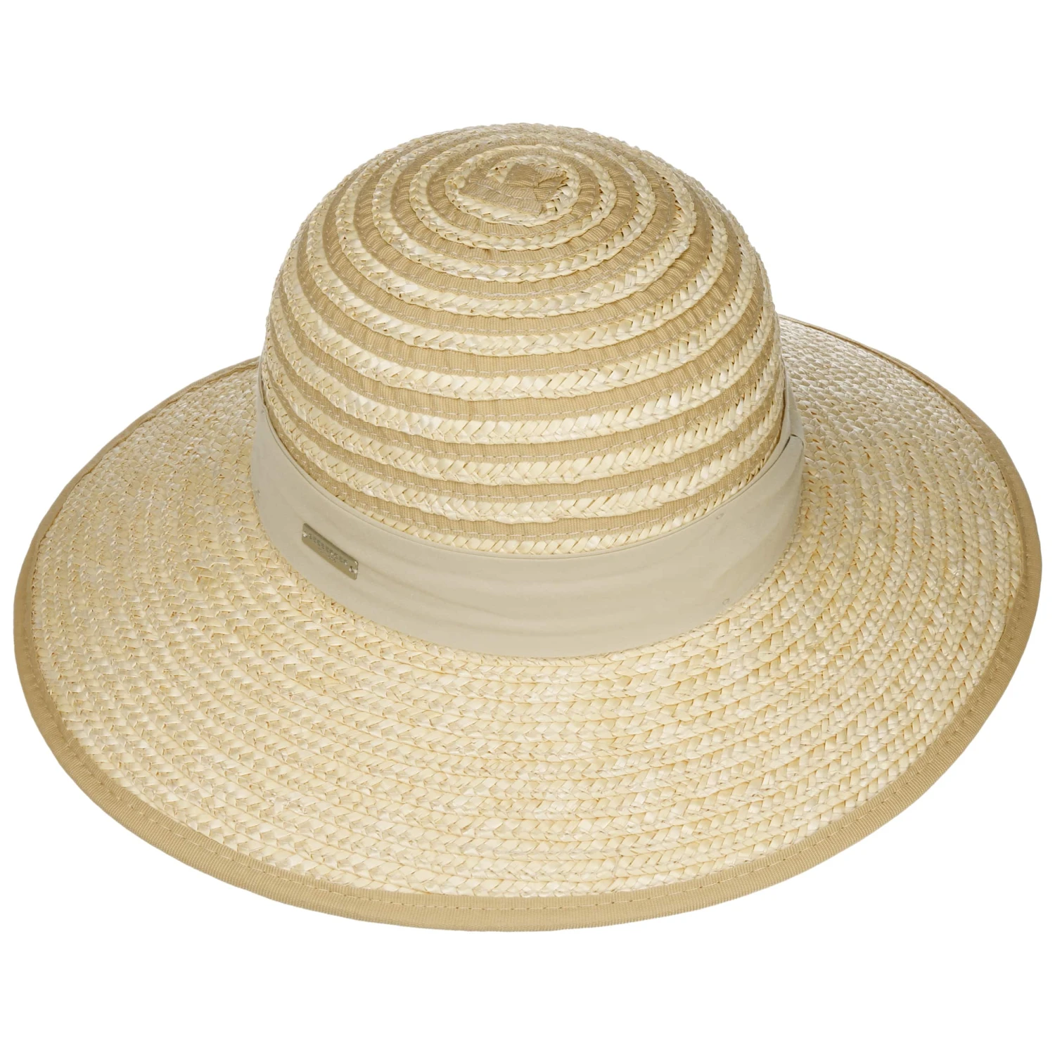 Mit naturfarbener Strohborte hergestellt zeigt der Strohhut von Seeberger ein dezentes Streifenmuster an der Krone.