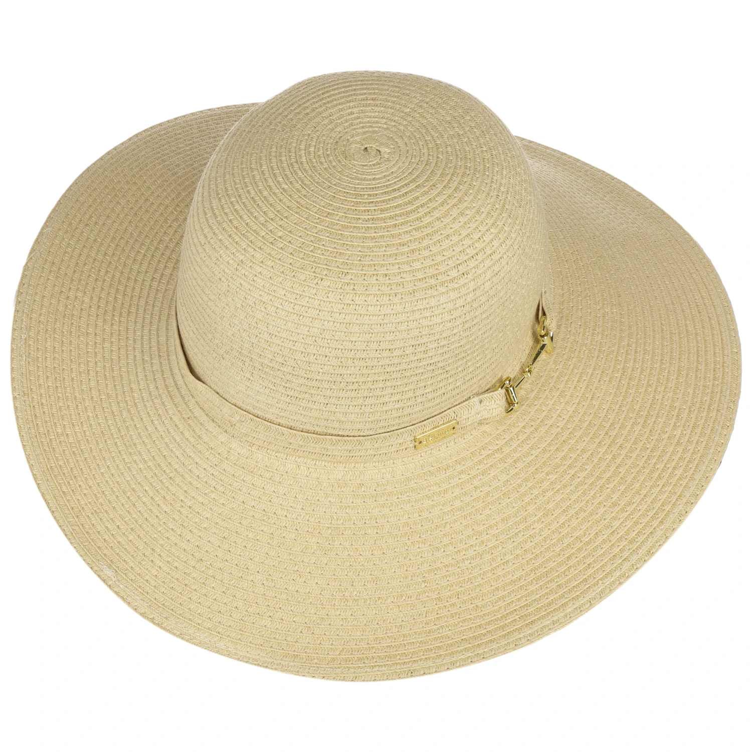 Unifarben präsentiert sich der mit UV-Schutz ausgestattete Strohhut und umgibt sich mit einer ebensolchen Garnitur. Darauf setzen das metallen schimmernde Markenemblem nebst der zierende Verschluss der Garnitur dezent glänzende Akzente.