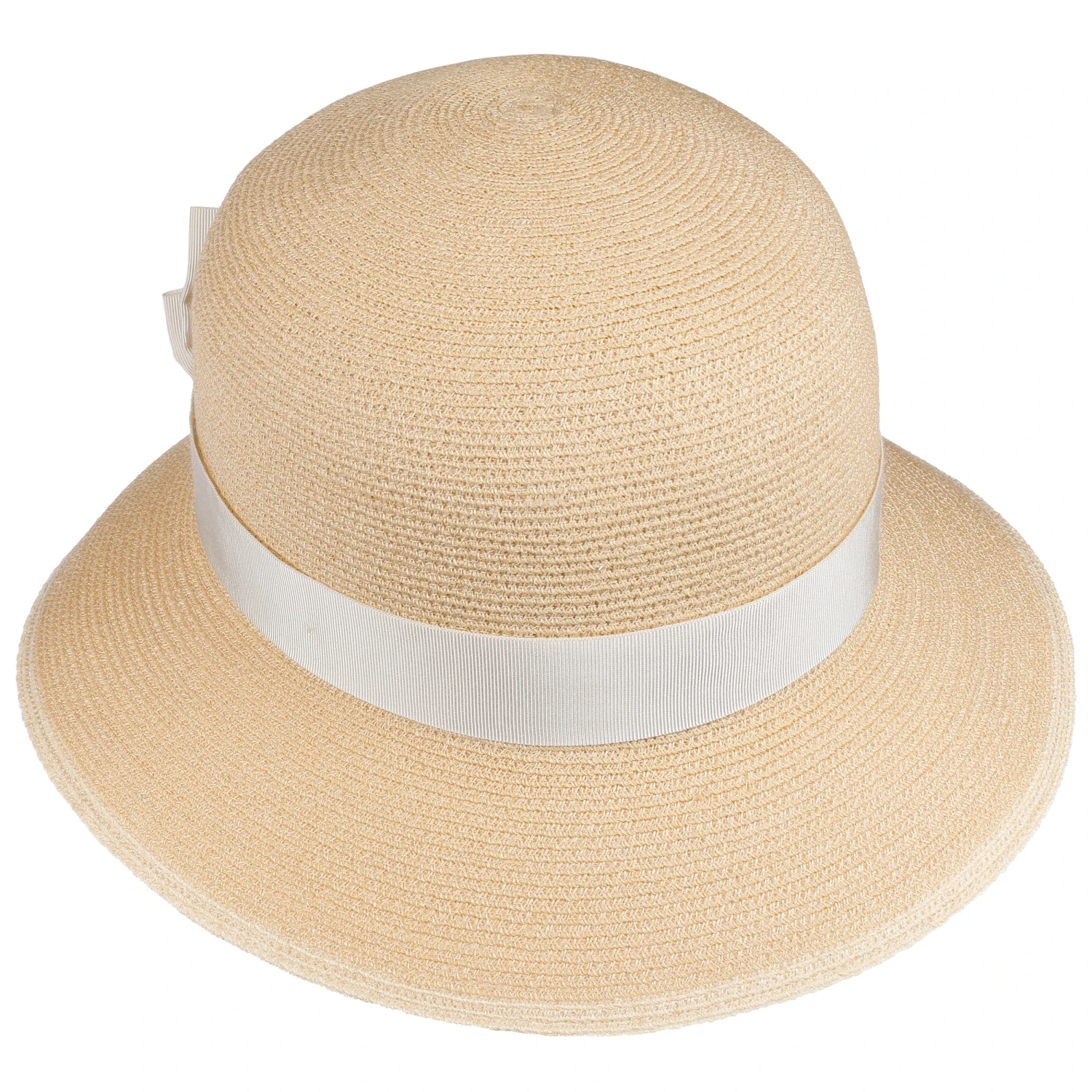 Ihr von Hand gefertigtes Material wirkt wunderbar leicht, elegant und sommerlich. Die sanft geneigte Krempe und ein zart glänzendes Ripsband mit Applikation komplettieren den romantisch wirkenden Look.