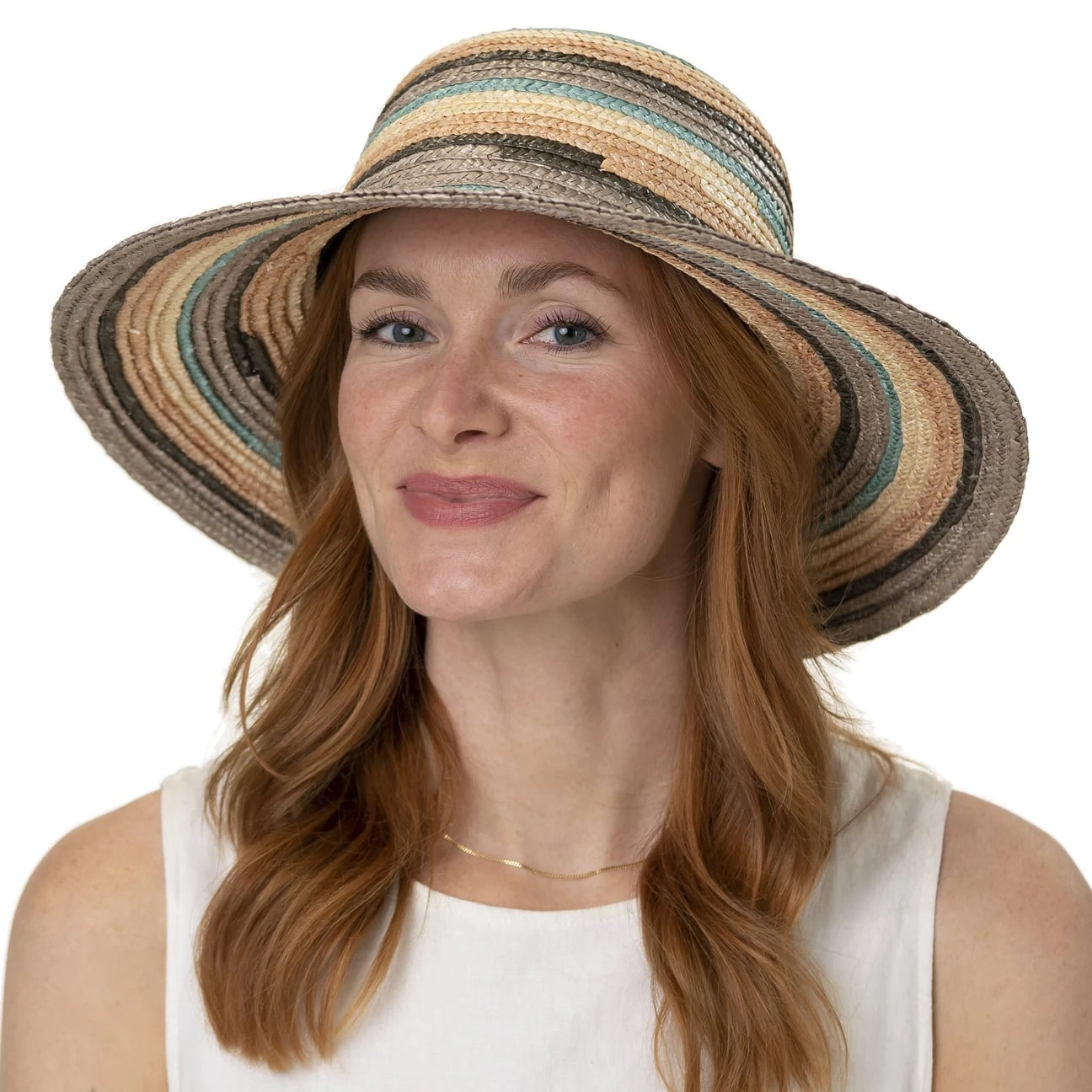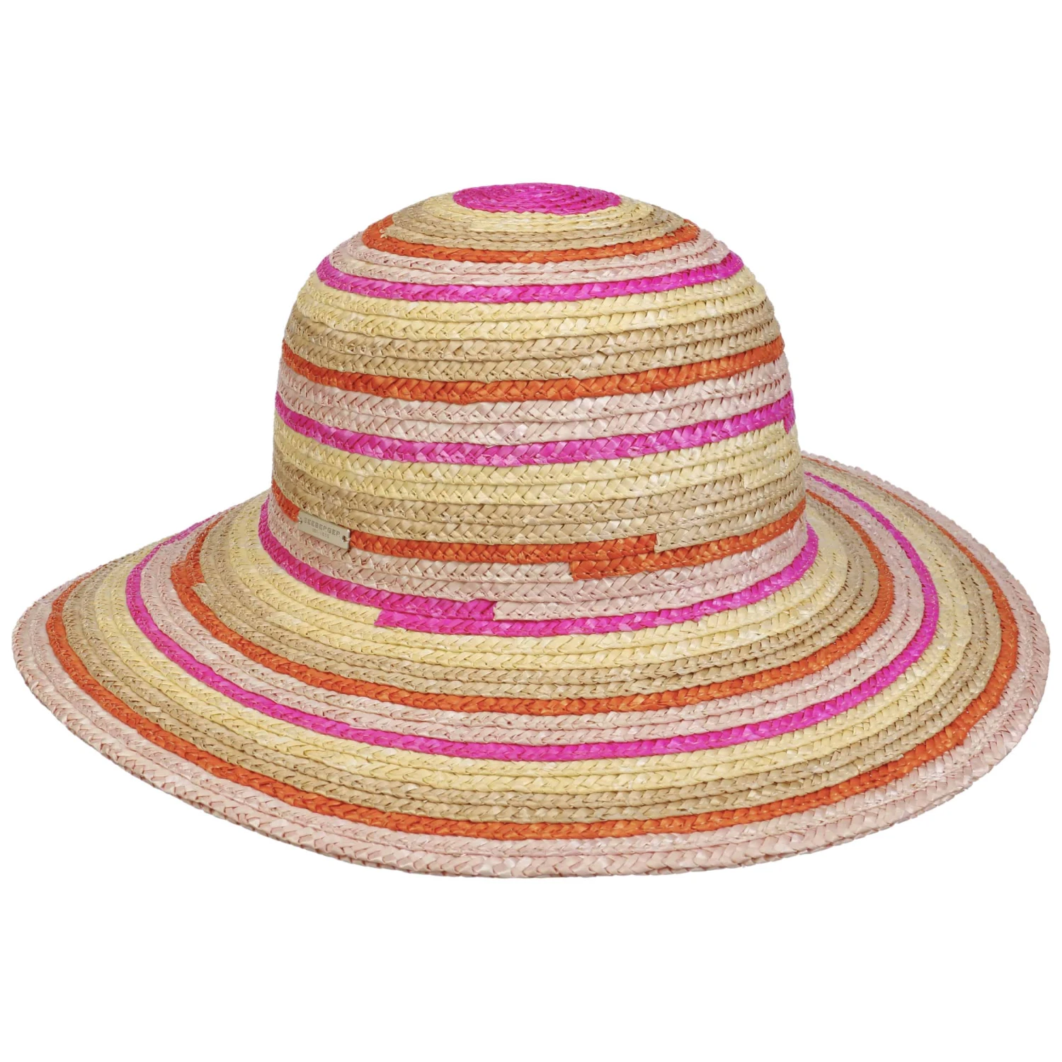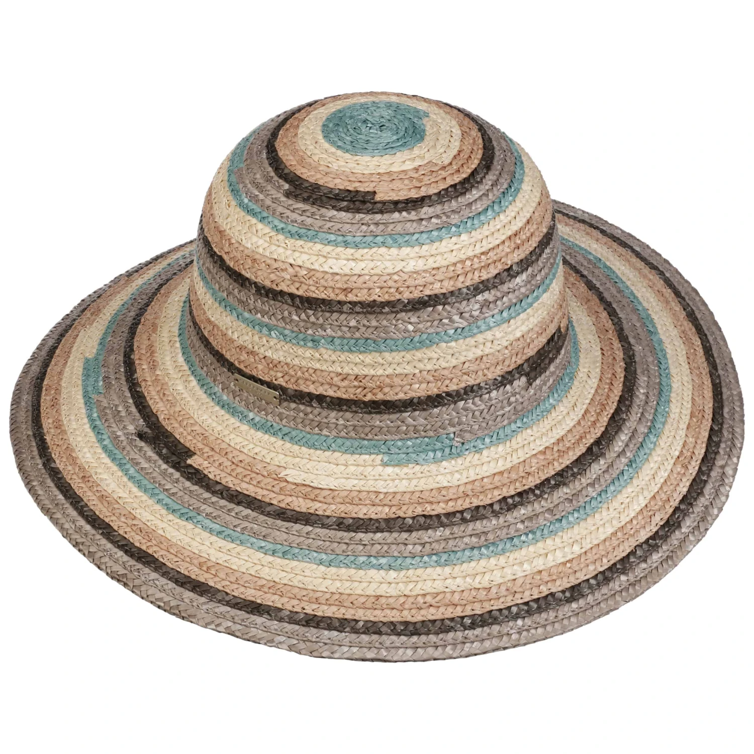 Im Fokus steht dabei das mehrfarbige Ringelmuster, das den gesamten runden Kopf wie auch die extra breite Krempe ziert. Die feinen Streifen setzen auch die edle Optik des Flechtwerks in Szene. Ein integriertes Klettband ermöglicht es der Trägerin, die Größe des Strohhutes nach Bedarf anzupassen.