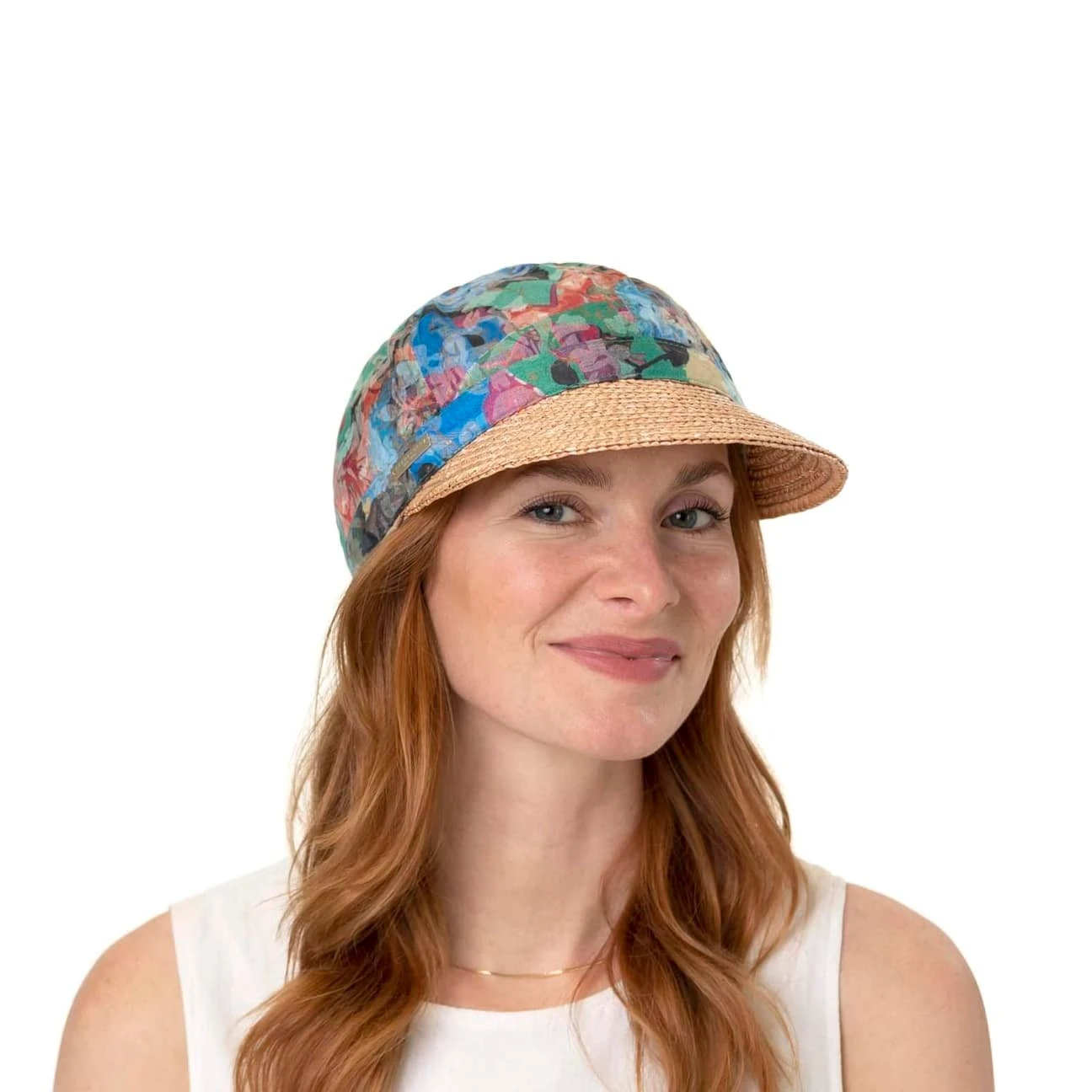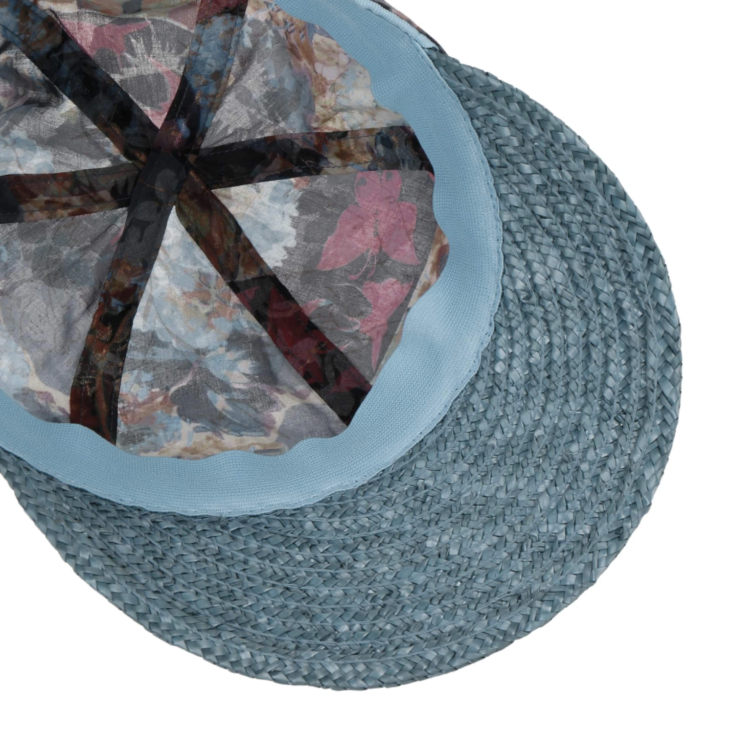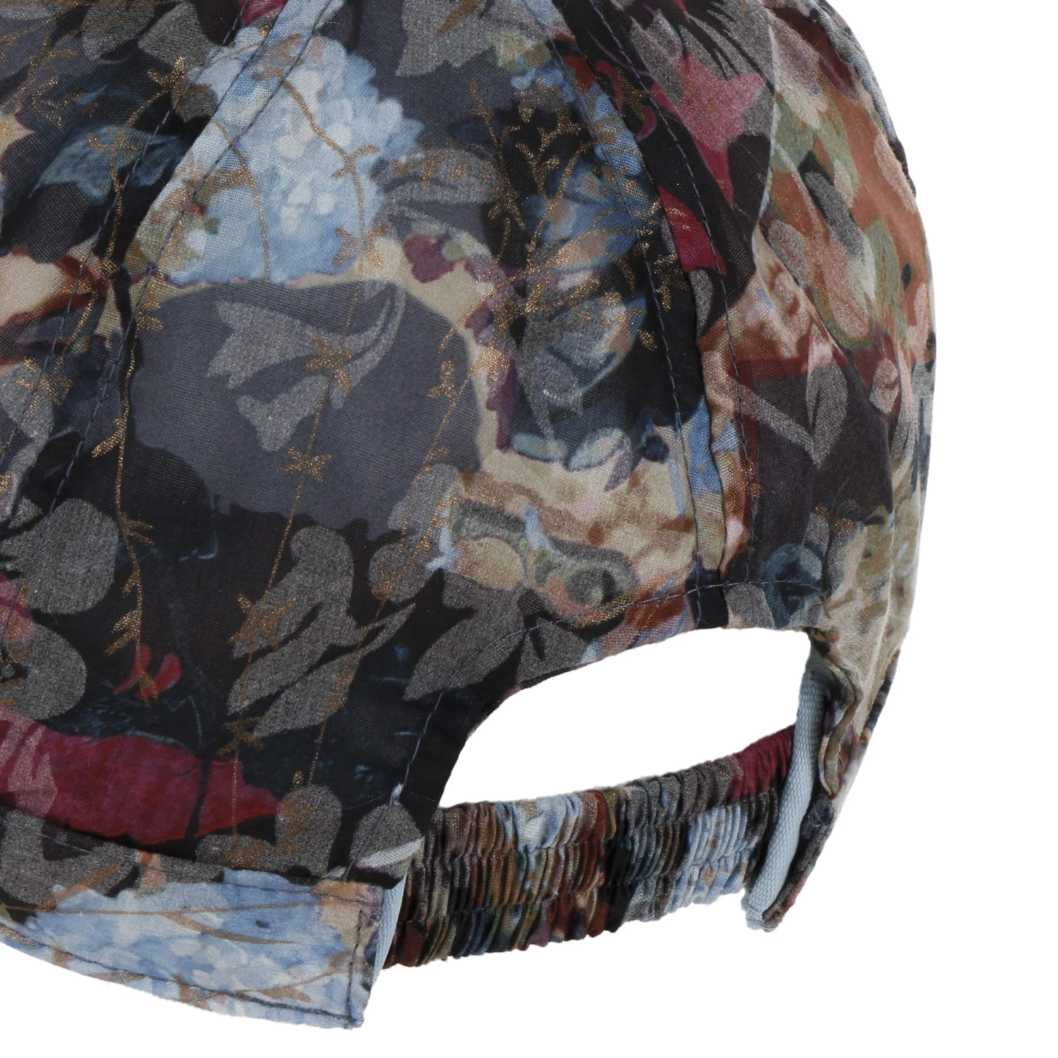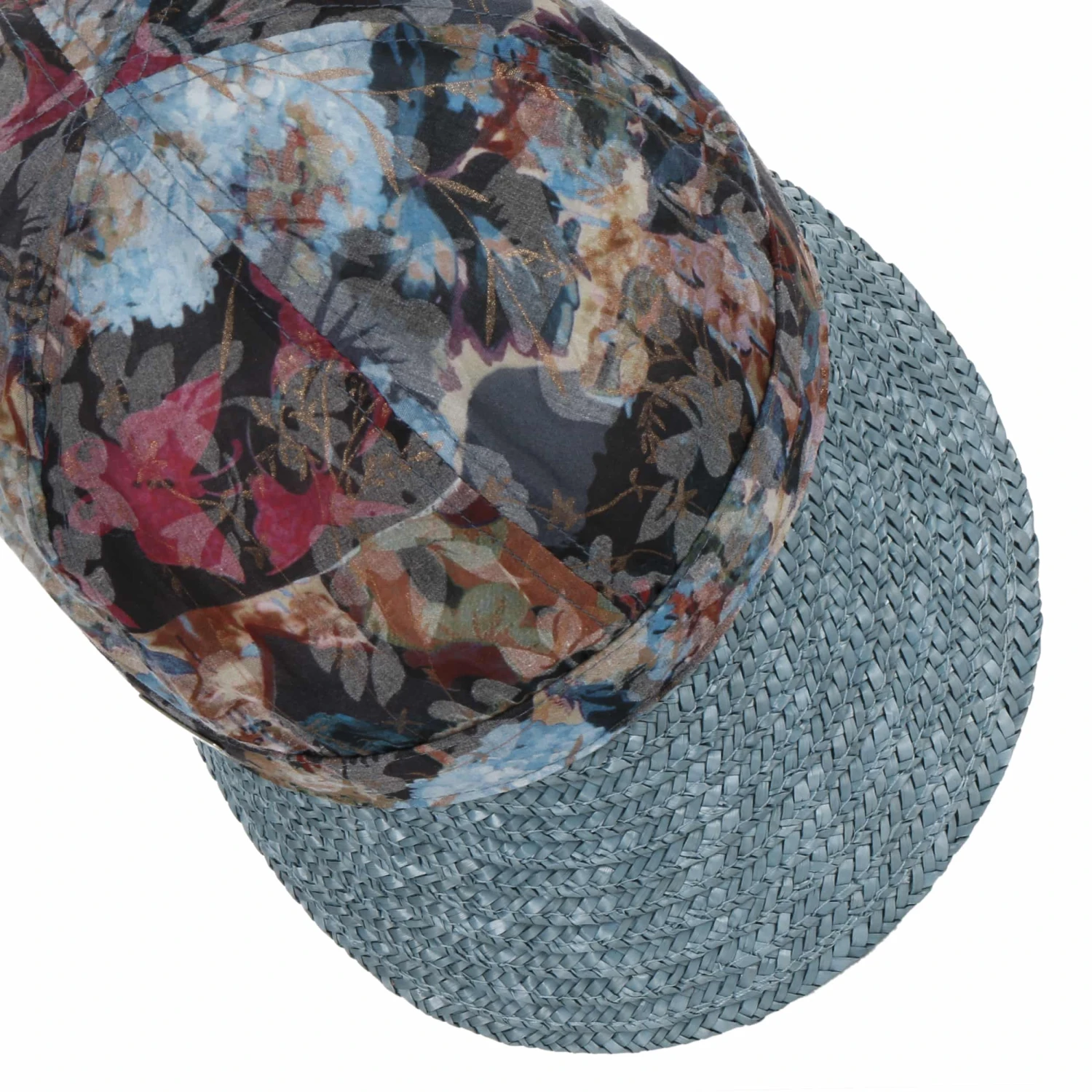 Bei dieser modischen Kappe von Seeberger besteht das mehrfarbige Kopfteil aus einem geblümten Mischgewebe, das auch viel Baumwolle enthält.